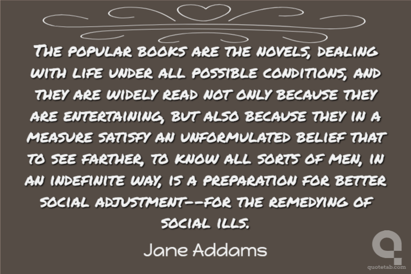 The popular books are the novels, dealing with life under all possible conditions, and they are widely read not only because they are entertaining, but also because they in a measure satisfy an unformulated belief that to see farther, to know all sorts of men, in an indefinite way, is a preparation for better social adjustment--for the remedying of social ills.