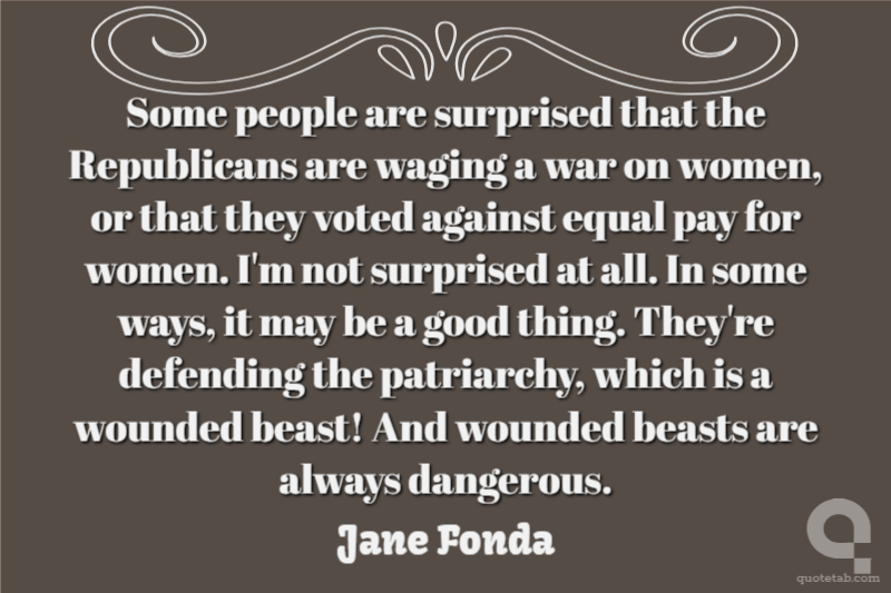 Some people are surprised that the Republicans are waging a war on women, or that they voted against equal pay for women. I'm not surprised at all. In some ways, it may be a good thing. They're defending the patriarchy, which is a wounded beast! And wounded beasts are always dangerous.