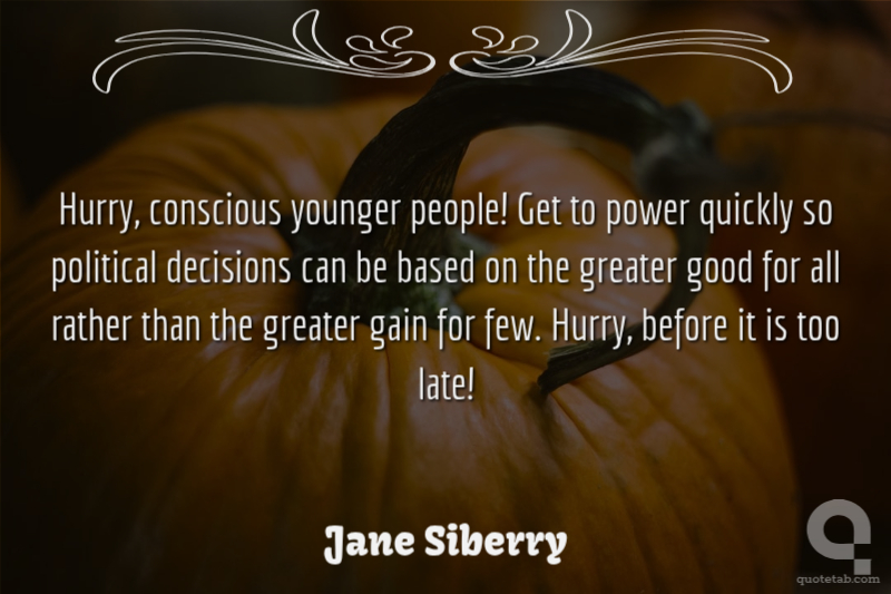 Hurry, conscious younger people! Get to power quickly so political decisions can be based on the greater good for all rather than the greater gain for few. Hurry, before it is too late!