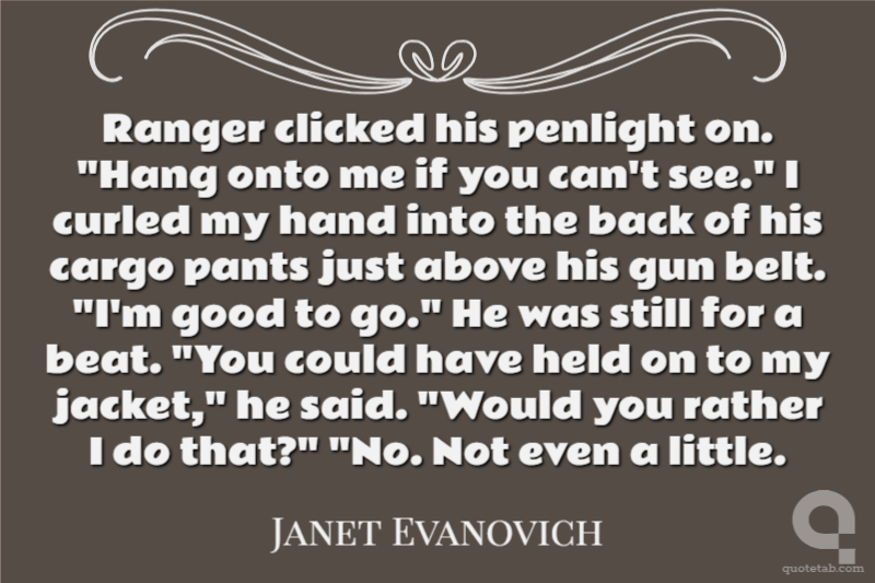 Ranger clicked his penlight on. "Hang onto me if you can't see." I curled my hand into the back of his cargo pants just above his gun belt. "I'm good to go." He was still for a beat. "You could have held on to my jacket," he said. "Would you rather I do that?" "No. Not even a little.