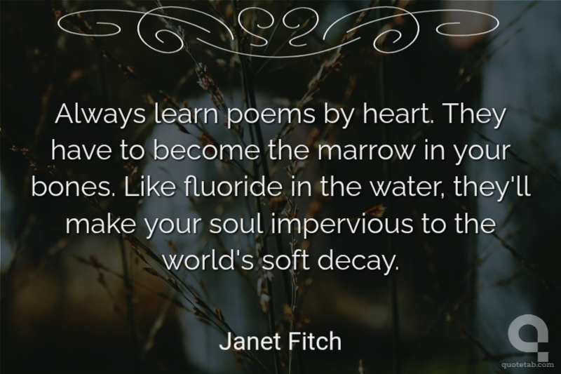 Always learn poems by heart. They have to become the marrow in your bones. Like fluoride in the water, they'll make your soul impervious to the world's soft decay.