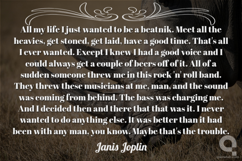All my life I just wanted to be a beatnik. Meet all the heavies, get stoned, get laid, have a good time. That's all I ever wanted. Except I knew I had a good voice and I could always get a couple of beers off of it. All of a sudden someone threw me in this rock 'n' roll band. They threw these musicians at me, man, and the sound was coming from behind. The bass was charging me. And I decided then and there that that was it. I never wanted to do anything else. It was better than it had been with any man, you know. Maybe that's the trouble.