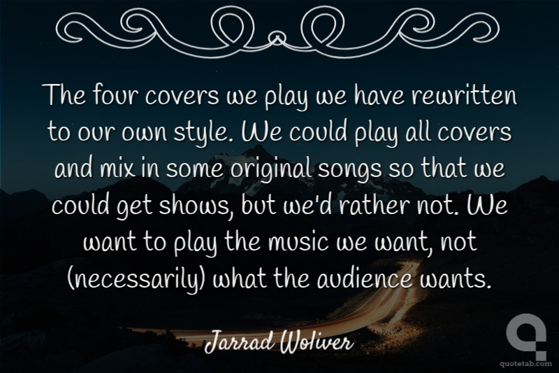 The four covers we play we have rewritten to our own style. We could play all covers and mix in some original songs so that we could get shows, but we'd rather not. We want to play the music we want, not (necessarily) what the audience wants.