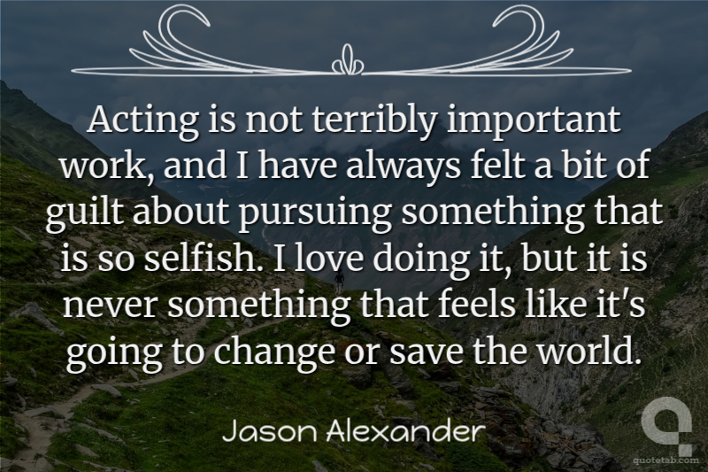 Acting is not terribly important work, and I have always felt a bit of guilt about pursuing something that is so selfish. I love doing it, but it is never something that feels like it's going to change or save the world.