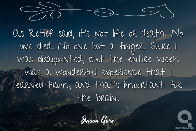 As Retief said, it's not life or death. No one died. No one lost a finger. Sure I was disappointed, but the entire week was a wonderful experience that I learned from, and that's important for the brain.