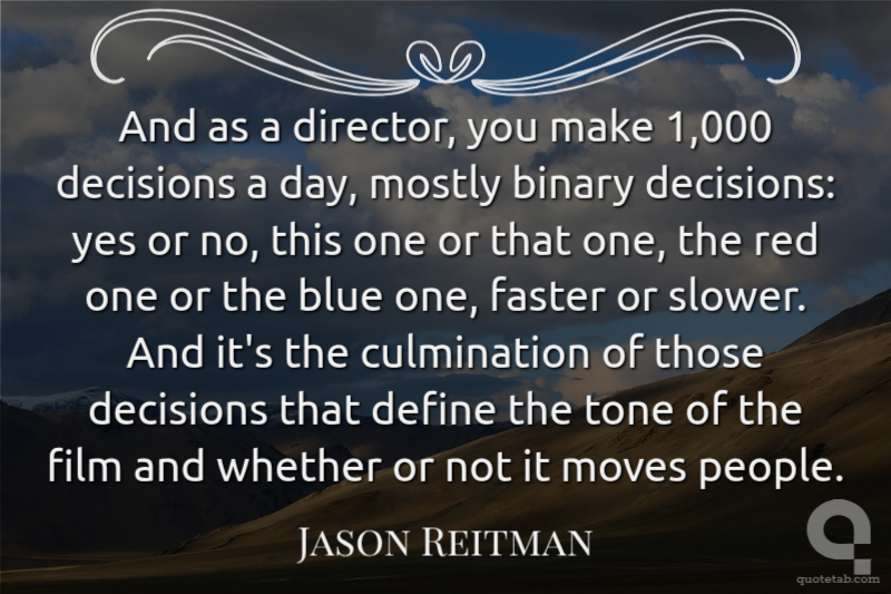 And as a director, you make 1,000 decisions a day, mostly binary decisions: yes or no, this one or that one, the red one or the blue one, faster or slower. And it's the culmination of those decisions that define the tone of the film and whether or not it moves people.