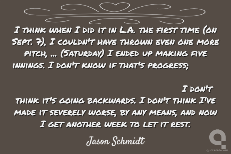 I think when I did it in L.A. the first time (on Sept. 7), I couldn't have thrown even one more pitch, ... (Saturday) I ended up making five innings. I don't know if that's progress; I don't think it's going backwards. I don't think I've made it severely worse, by any means, and now I get another week to let it rest.
