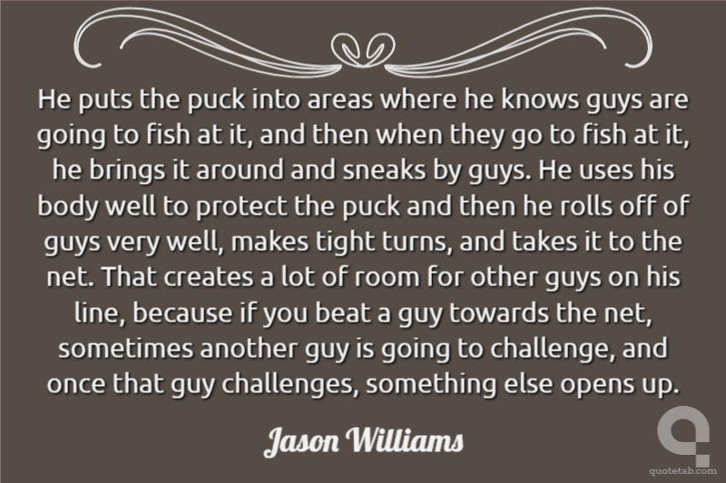 He puts the puck into areas where he knows guys are going to fish at it, and then when they go to fish at it, he brings it around and sneaks by guys. He uses his body well to protect the puck and then he rolls off of guys very well, makes tight turns, and takes it to the net. That creates a lot of room for other guys on his line, because if you beat a guy towards the net, sometimes another guy is going to challenge, and once that guy challenges, something else opens up.