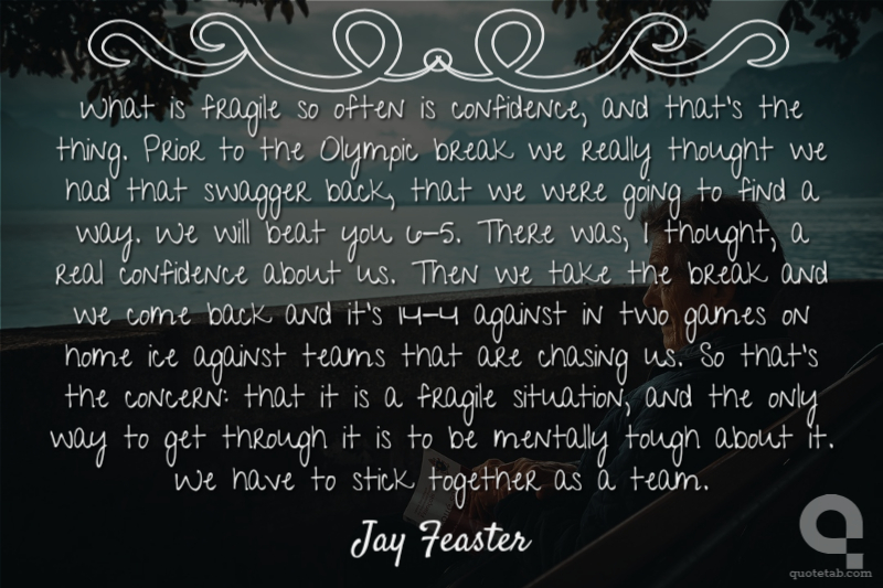 What is fragile so often is confidence, and that's the thing. Prior to the Olympic break we really thought we had that swagger back, that we were going to find a way. We will beat you 6-5. There was, I thought, a real confidence about us. Then we take the break and we come back and it's 14-4 against in two games on home ice against teams that are chasing us. So that's the concern: that it is a fragile situation, and the only way to get through it is to be mentally tough about it. We have to stick together as a team.
