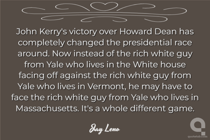 John Kerry's victory over Howard Dean has completely changed the presidential race around. Now instead of the rich white guy from Yale who lives in the White house facing off against the rich white guy from Yale who lives in Vermont, he may have to face the rich white guy from Yale who lives in Massachusetts. It's a whole different game.