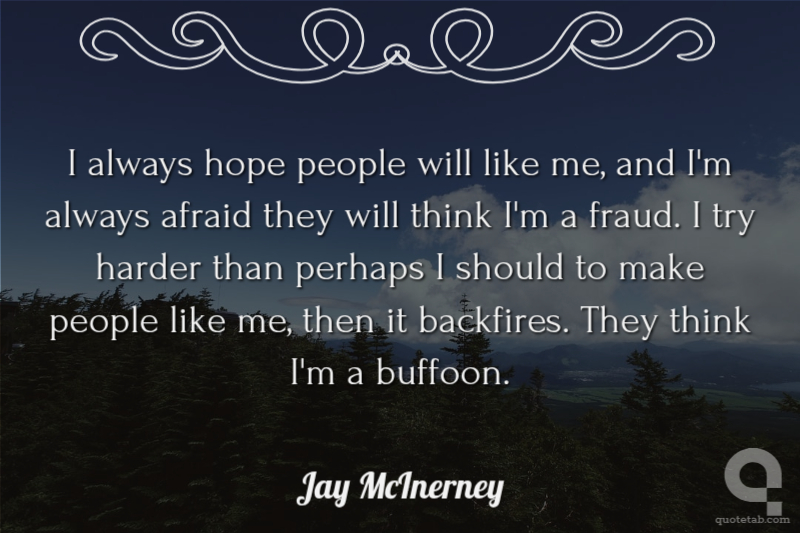 I always hope people will like me, and I'm always afraid they will think I'm a fraud. I try harder than perhaps I should to make people like me, then it backfires. They think I'm a buffoon.