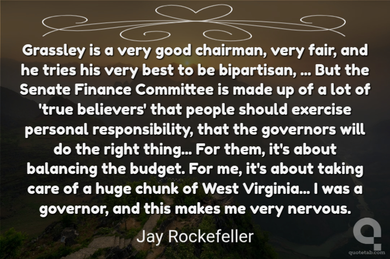 Grassley is a very good chairman, very fair, and he tries his very best to be bipartisan, ... But the Senate Finance Committee is made up of a lot of 'true believers' that people should exercise personal responsibility, that the governors will do the right thing... For them, it's about balancing the budget. For me, it's about taking care of a huge chunk of West Virginia... I was a governor, and this makes me very nervous.
