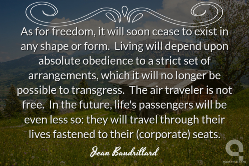 As for freedom, it will soon cease to exist in any shape or form. Living will depend upon absolute obedience to a strict set of arrangements, which it will no longer be possible to transgress. The air traveler is not free. In the future, life's passengers will be even less so: they will travel through their lives fastened to their (corporate) seats.