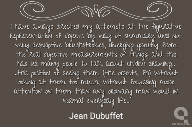 I have always directed my attempts at the figurative representation of objects by way of summary and not very descriptive brushstrokes, diverging greatly from the real objective measurements of things, and this has led many people to talk about childish drawing.. ..this position of seeing them (the objects, fh) without looking at them too much, without focussing more attention on them than any ordinary man would in normal everyday life..
