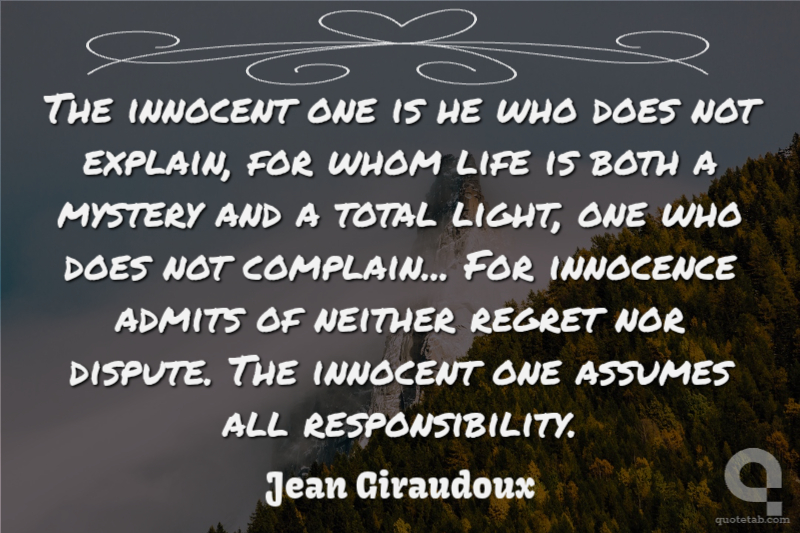 The innocent one is he who does not explain, for whom life is both a mystery and a total light, one who does not complain... For innocence admits of neither regret nor dispute. The innocent one assumes all responsibility.