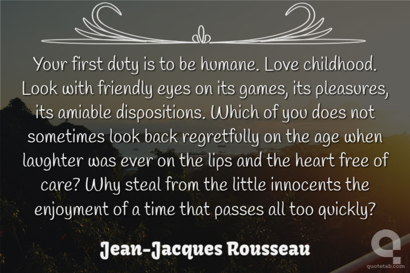 Your first duty is to be humane. Love childhood. Look with friendly eyes on its games, its pleasures, its amiable dispositions. Which of you does not sometimes look back regretfully on the age when laughter was ever on the lips and the heart free of care? Why steal from the little innocents the enjoyment of a time that passes all too quickly?