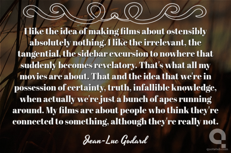 I like the idea of making films about ostensibly absolutely nothing. I like the irrelevant, the tangential, the sidebar excursion to nowhere that suddenly becomes revelatory. That's what all my movies are about. That and the idea that we're in possession of certainty, truth, infallible knowledge, when actually we're just a bunch of apes running around. My films are about people who think they're connected to something, although they're really not.