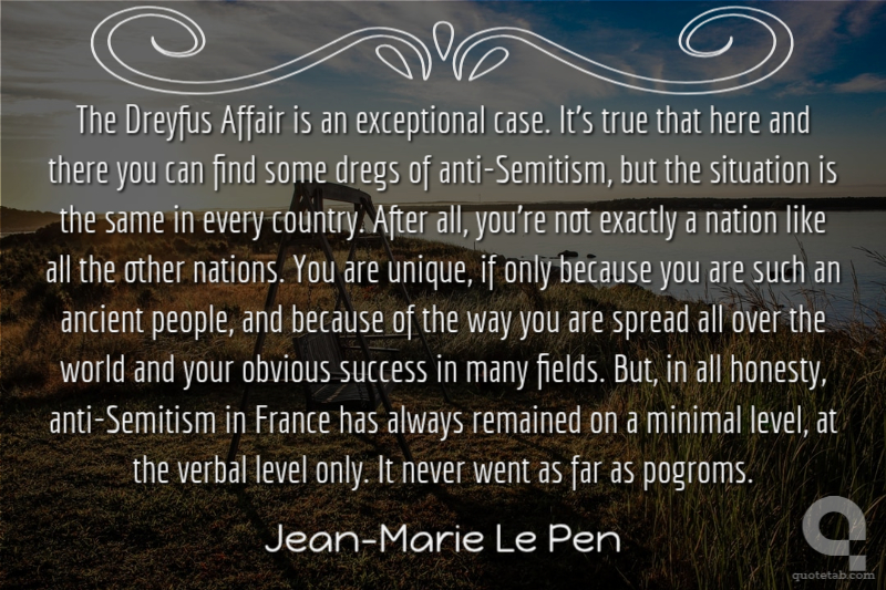 The Dreyfus Affair is an exceptional case. It's true that here and there you can find some dregs of anti-Semitism, but the situation is the same in every country. After all, you're not exactly a nation like all the other nations. You are unique, if only because you are such an ancient people, and because of the way you are spread all over the world and your obvious success in many fields. But, in all honesty, anti-Semitism in France has always remained on a minimal level, at the verbal level only. It never went as far as pogroms.
