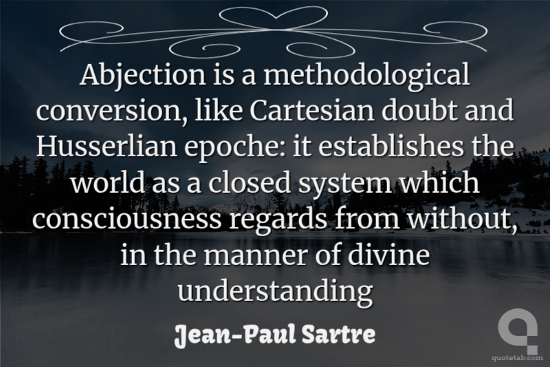 Abjection is a methodological conversion, like Cartesian doubt and Husserlian epoche: it establishes the world as a closed system which consciousness regards from without, in the manner of divine understanding