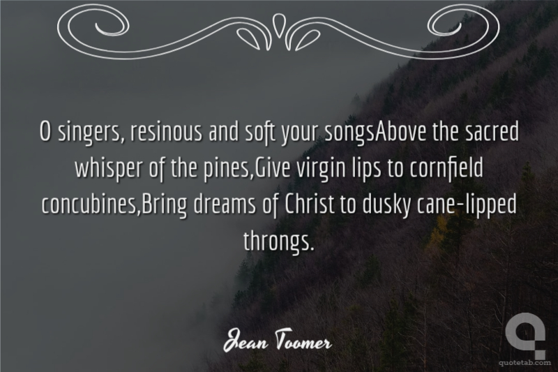 O singers, resinous and soft your songsAbove the sacred whisper of the pines,Give virgin lips to cornfield concubines,Bring dreams of Christ to dusky cane-lipped throngs.