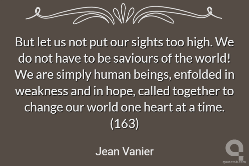 But let us not put our sights too high. We do not have to be saviours of the world! We are simply human beings, enfolded in weakness and in hope, called together to change our world one heart at a time. (163)