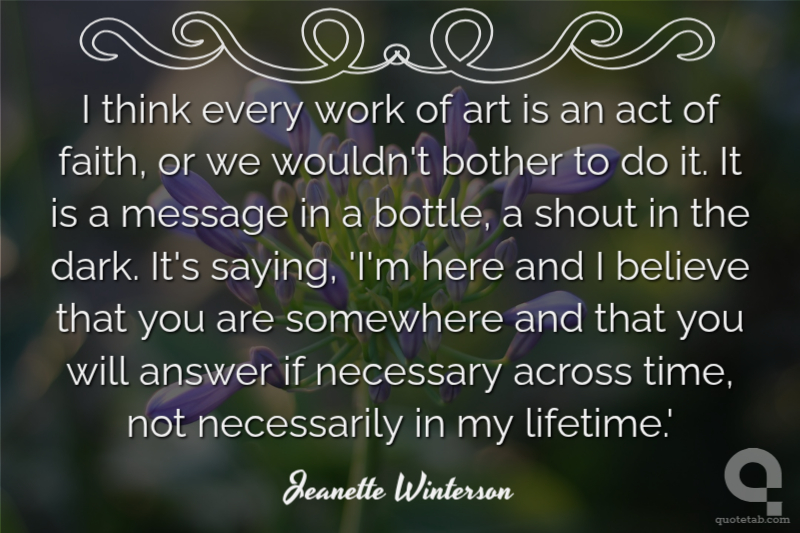 I think every work of art is an act of faith, or we wouldn't bother to do it. It is a message in a bottle, a shout in the dark. It's saying, 'I'm here and I believe that you are somewhere and that you will answer if necessary across time, not necessarily in my lifetime.'