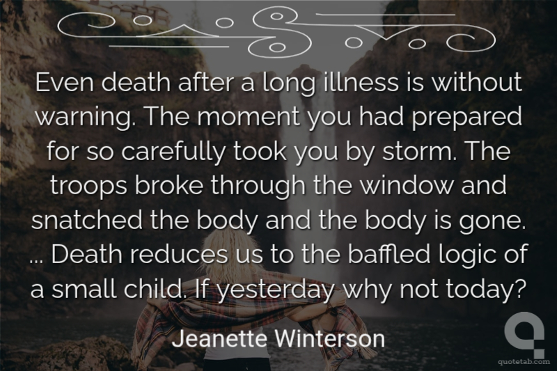 Even death after a long illness is without warning. The moment you had prepared for so carefully took you by storm. The troops broke through the window and snatched the body and the body is gone. ... Death reduces us to the baffled logic of a small child. If yesterday why not today?