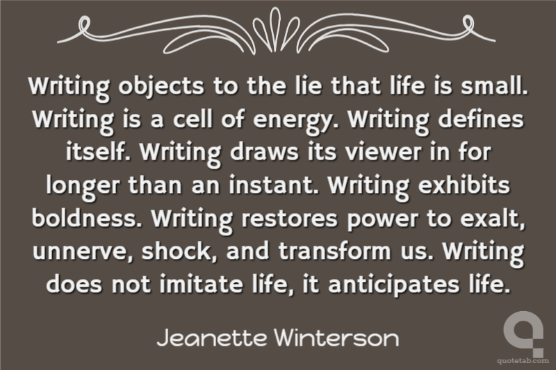 Writing objects to the lie that life is small. Writing is a cell of energy. Writing defines itself. Writing draws its viewer in for longer than an instant. Writing exhibits boldness. Writing restores power to exalt, unnerve, shock, and transform us. Writing does not imitate life, it anticipates life.