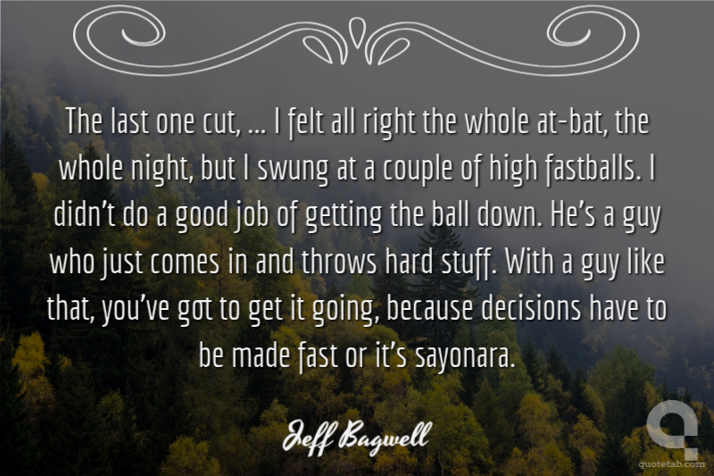 The last one cut, ... I felt all right the whole at-bat, the whole night, but I swung at a couple of high fastballs. I didn't do a good job of getting the ball down. He's a guy who just comes in and throws hard stuff. With a guy like that, you've got to get it going, because decisions have to be made fast or it's sayonara.