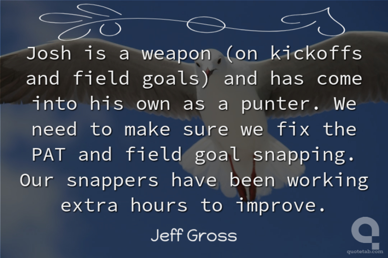 Josh is a weapon (on kickoffs and field goals) and has come into his own as a punter. We need to make sure we fix the PAT and field goal snapping. Our snappers have been working extra hours to improve.