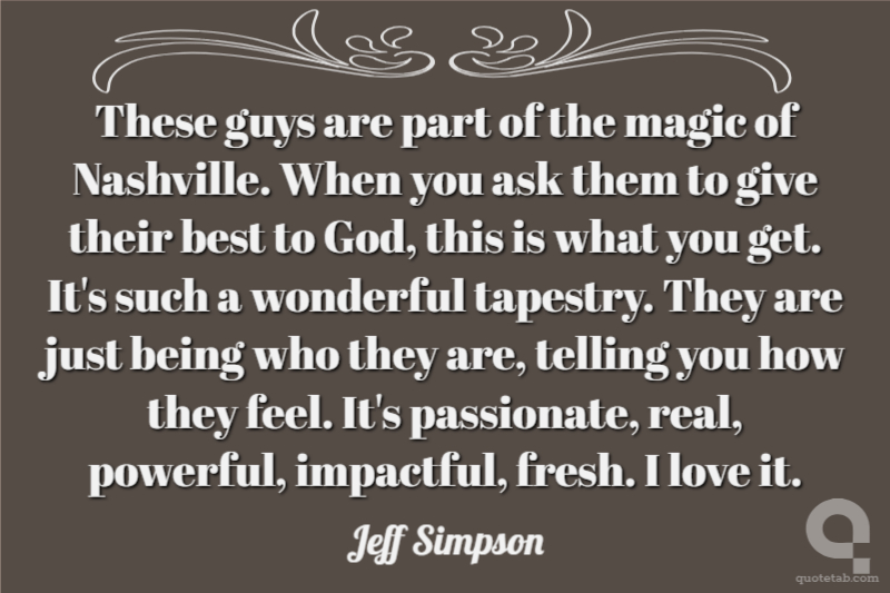 These guys are part of the magic of Nashville. When you ask them to give their best to God, this is what you get. It's such a wonderful tapestry. They are just being who they are, telling you how they feel. It's passionate, real, powerful, impactful, fresh. I love it.