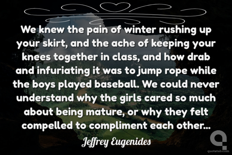 We knew the pain of winter rushing up your skirt, and the ache of keeping your knees together in class, and how drab and infuriating it was to jump rope while the boys played baseball. We could never understand why the girls cared so much about being mature, or why they felt compelled to compliment each other...