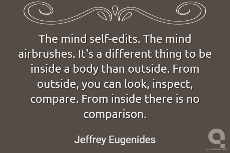 The mind self-edits. The mind airbrushes. It's a different thing to be inside a body than outside. From outside, you can look, inspect, compare. From inside there is no comparison.