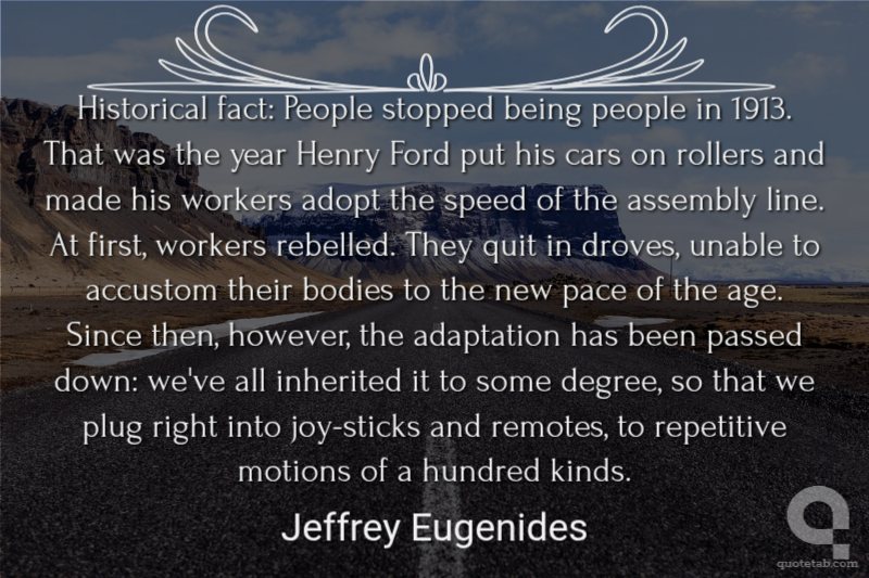 Historical fact: People stopped being people in 1913. That was the year Henry Ford put his cars on rollers and made his workers adopt the speed of the assembly line. At first, workers rebelled. They quit in droves, unable to accustom their bodies to the new pace of the age. Since then, however, the adaptation has been passed down: we've all inherited it to some degree, so that we plug right into joy-sticks and remotes, to repetitive motions of a hundred kinds.
