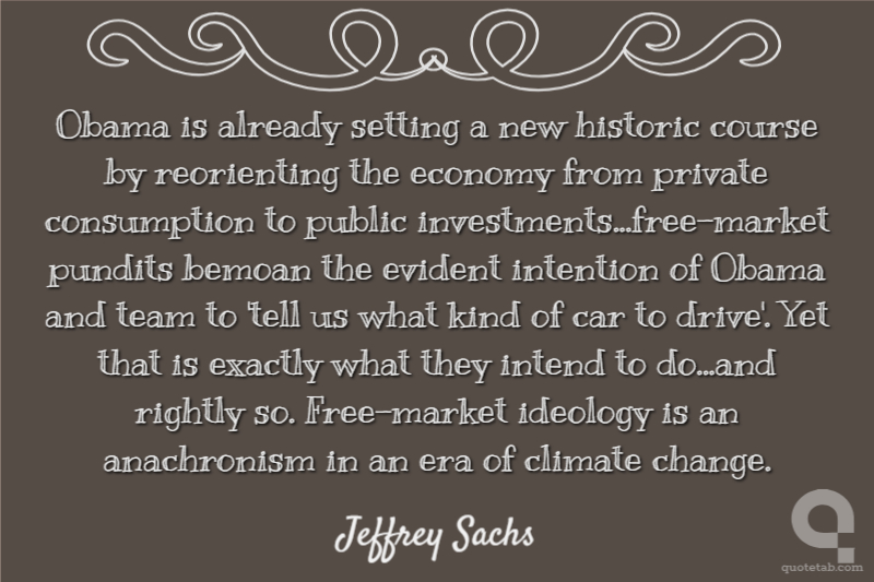 Obama is already setting a new historic course by reorienting the economy from private consumption to public investments...free-market pundits bemoan the evident intention of Obama and team to 'tell us what kind of car to drive'. Yet that is exactly what they intend to do...and rightly so. Free-market ideology is an anachronism in an era of climate change.