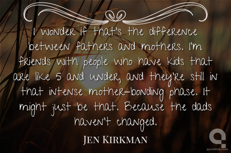 I wonder if that's the difference between fathers and mothers. I'm friends with people who have kids that are like 5 and under, and they're still in that intense mother-bonding phase. It might just be that. Because the dads haven't changed.