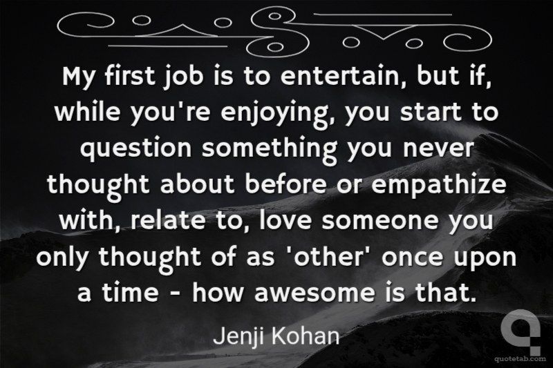 My first job is to entertain, but if, while you're enjoying, you start to question something you never thought about before or empathize with, relate to, love someone you only thought of as 'other' once upon a time - how awesome is that.