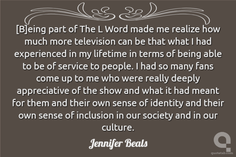 [B]eing part of The L Word made me realize how much more television can be that what I had experienced in my lifetime in terms of being able to be of service to people. I had so many fans come up to me who were really deeply appreciative of the show and what it had meant for them and their own sense of identity and their own sense of inclusion in our society and in our culture.