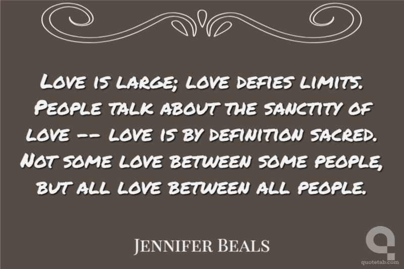 Love is large; love defies limits. People talk about the sanctity of love -- love is by definition sacred. Not some love between some people, but all love between all people.