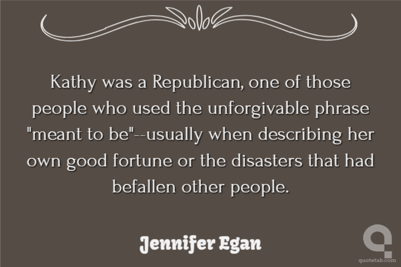 Kathy was a Republican, one of those people who used the unforgivable phrase "meant to be"--usually when describing her own good fortune or the disasters that had befallen other people.