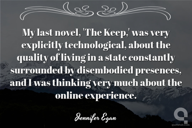 My last novel, 'The Keep,' was very explicitly technological, about the quality of living in a state constantly surrounded by disembodied presences, and I was thinking very much about the online experience.