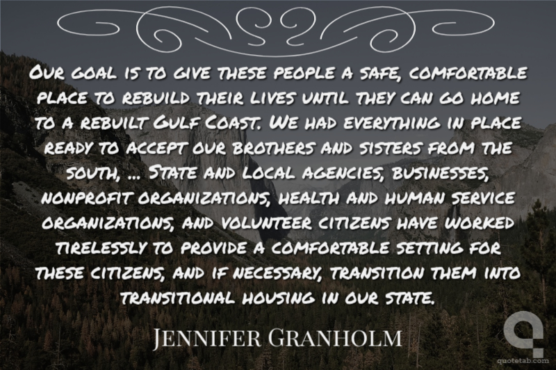Our goal is to give these people a safe, comfortable place to rebuild their lives until they can go home to a rebuilt Gulf Coast. We had everything in place ready to accept our brothers and sisters from the south, ... State and local agencies, businesses, nonprofit organizations, health and human service organizations, and volunteer citizens have worked tirelessly to provide a comfortable setting for these citizens, and if necessary, transition them into transitional housing in our state.