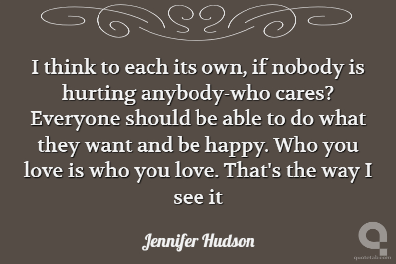 I think to each its own, if nobody is hurting anybody-who cares? Everyone should be able to do what they want and be happy. Who you love is who you love. That's the way I see it