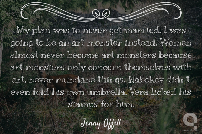 My plan was to never get married. I was going to be an art monster instead. Women almost never become art monsters because art monsters only concern themselves with art, never mundane things. Nabokov didn't even fold his own umbrella. Vera licked his stamps for him.