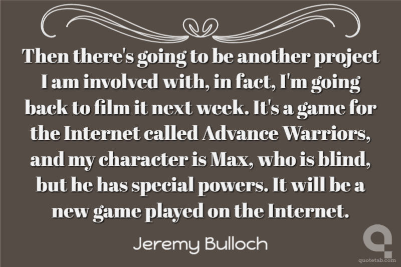 Then there's going to be another project I am involved with, in fact, I'm going back to film it next week. It's a game for the Internet called Advance Warriors, and my character is Max, who is blind, but he has special powers. It will be a new game played on the Internet.