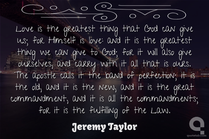Love is the greatest thing that God can give us; for Himself is love: and it is the greatest thing we can give to God; for it will also give ourselves, and carry with it all that is ours. The apostle calls it the band of perfection; it is the old, and it is the new, and it is the great commandment, and it is all the commandments; for it is the fulfilling of the Law.