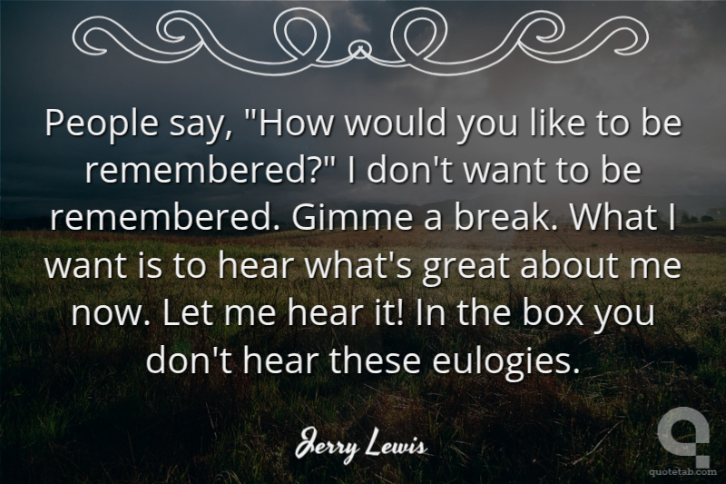 People say, "How would you like to be remembered?" I don't want to be remembered. Gimme a break. What I want is to hear what's great about me now. Let me hear it! In the box you don't hear these eulogies.