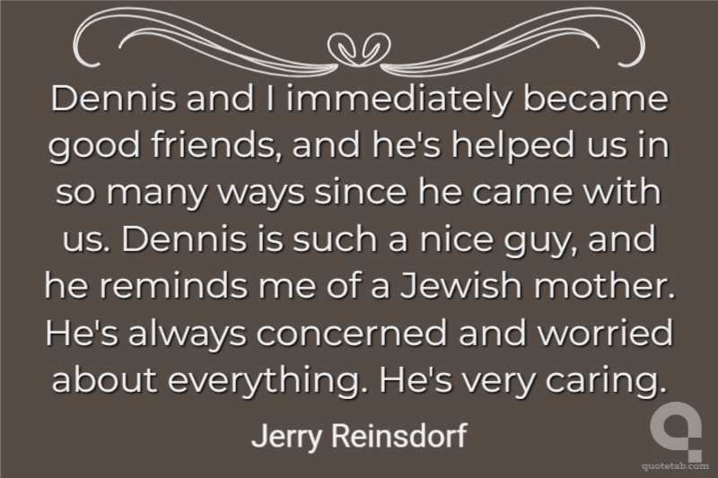 Dennis and I immediately became good friends, and he's helped us in so many ways since he came with us. Dennis is such a nice guy, and he reminds me of a Jewish mother. He's always concerned and worried about everything. He's very caring.