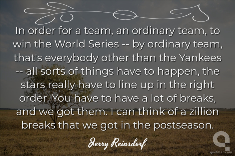 In order for a team, an ordinary team, to win the World Series -- by ordinary team, that's everybody other than the Yankees -- all sorts of things have to happen, the stars really have to line up in the right order. You have to have a lot of breaks, and we got them. I can think of a zillion breaks that we got in the postseason.