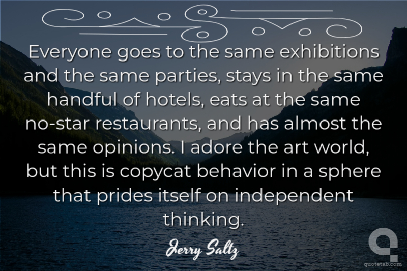 Everyone goes to the same exhibitions and the same parties, stays in the same handful of hotels, eats at the same no-star restaurants, and has almost the same opinions. I adore the art world, but this is copycat behavior in a sphere that prides itself on independent thinking.